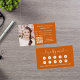 Um fundo cor de laranja queimado pela tendência, texto branco Na frente: Adicione seu desconto. Voltar: Personalize e adicione sua foto, nome, título, número de telefone, email, endereço do site, código qr ao seu site.
