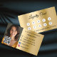 Crie lealdade ao cliente em estilo com este cartão de fidelidade comercial ouro. A frente apresenta círculos elegantes para marcar cada compra ou visita, enquanto a parte traseira inclui espaço para o logotipo da sua empresa, código QR, informações de contato. Ideal para salões, cafés, boutiques e empresas de serviços que querem manter os clientes voltando. Criado profissionalmente para fazer sua marca se destacar on-line e pessoalmente. Na frente: adicione desconto. Voltar: Personalize e adicione seu nome, título, número de telefone, email, endereço de site, logotipo de empresa. Ícones do Facebook e Instagram.