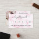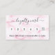 Mármore cor-de-rosa como fundo, texto preto Na frente: Adicione seu desconto. Voltar: Personalize e adicione sua foto, nome, título, número de telefone, email, endereço do site, código qr ao seu site. Letras roxas. Sem brilho nas costas.