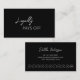 Cartão de fidelidade preto moderno e profissional, com um design simples e mínimo com "Loyalty Pays Off" em um roteiro elegante e fonte de sans serif contemporânea. A parte de trás tem suas informações de contato em um layout minimalista. Este cartão de fidelidade é excelente de um salão de beleza, maquiador, magistrado técnico ou compro de café.