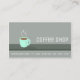 Um cartão de visita elegante ideal para um compro de café ou um café. A design mostra uma xícara de café a vapor na frente, incluindo o nome do compro de café e as horas de abertura. A parte de trás da design mostra os elementos de fidelidade com nove copos de café numerados e um que mostra a palavra "livre" nela.