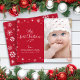 "Meu Primeiro Natal." Um visual lúdico de flocos de neve brancos e tipografia de script manuscrito, sobrepondo um painel vermelho e a foto de sua escolha, o ajuda a lançar no Natal e Ano Novo. No verso, flocos de neve brancos adicionais cobrem um fundo vermelho. Sinta o calor e a alegria da temporada de festas sempre que você envia este cartão de saudação de fotos de bebê personalizado e na moda e moderno. Perfeito para os pais que se orgulham de mandarem alguém especial! Basta substituir esta foto de exemplo por uma de suas, digitar os nomes de sua escolha, e você pode personalizar facilmente este cartão de saudação de fotos de Natal. Por favor, me mande mensagens com quaisquer perguntas ou solicitações.