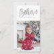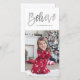 Este design de cartão de foto de natal sazonal apresenta um fundo branco de inverno com uma fonte manuscrita que diz "Acredite" em folha de alumínio falsa prateada.