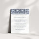 Projetado para coordenar com a nossa coleção de casamento Santorini em Marinho, este elegante cartão de informação de convidado mediterrânico apresenta uma inscrição azul marinho acentuada com uma borda superior em um padrão de azulejo geométrico em marinho e branco. Substitua o texto da amostra pelos detalhes chave da sua celebração do casamento. Que informações incluir em um convite de casamento? Considere detalhes como acomodações de hotel, códigos de grupo, transporte, instruções, informações de recepção de boas-vindas e sua URL do site de casamento. Você pode até fazer upload de um mapa para o lado inverso usando a função personalizar. Precisa de ajuda com o texto ou a formatação? Eu adoraria ajudar! Entre em contato com Kristen através do link "contate este designer".