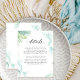 Cartão de gabinete de detalhes simples e moderno, onde você pode adicionar qualquer informação extra para seus convidados. Liberdade para adicionar qualquer informação que você quiser e até digitar diretamente na tela de edição e fazer os ajustes de texto que você quiser selecionando personalizar ainda mais. Turquesa delicada, aqua, fundo de cor azul empoeirado e verde-aquosa com areia, manchas de ouro sujas, tanto na frente como no verso, assim como detalhes verdes na frente. Folhas e folhagem em chás, aqua, verde limão, verde-sábio e ouro. Detalhes da caligrafia escrita à mão. Parte da nossa coleção "Airy Blue and Green Watercolor" com uma variedade de produtos coordenadores.