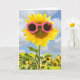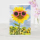 Óculos de sol rosa em girassol em campo de girassóis para aniversário.