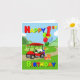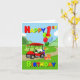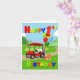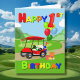 Ampliando a cena do aniversário, um carrinho de golfe vermelho brilhante traz entusiasmo e alegria! À frente, senta-se um bolo festivo com tema de golfe, enquanto as costas estão empilhadas com presentes coloridos e balões saltados com um balão gigante número 1. Com um texto de cor primária ousado, este cartão é perfeito para celebrar o dia especial de um menino.