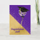 Cartão de saudação de graduação de na moda, com um fundo de meio roxo e meio dourado. Gráficos de um balão transparente, preto e dourado, com boné de formando, decoram a parte superior da placa. O texto púrpura personalizado, na parte inferior dourada da placa, dentro da placa e do texto, na parte traseira da placa, estão todos prontos para personalizar o seu formando.