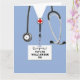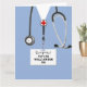Cartão de licenciatura para a escola de enfermagem ou para a medicina, com esfregões de hospital azul. Para personalizar o texto de edição para adicionar nome e credenciais de assistência de saúde.
