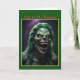 Este cartão de Halloween apresenta uma ilustração assustadoramente detalhada de um ghoul com pele esverdeada, olhos laranja brilhantes e presas ameaçadoras. O cabelo verde selvagem do ghoul aumenta a atmosfera sinistra, tornando-o uma escolha perfeita para aqueles que gostam do lado mais assustador do Halloween. A imagem é definida contra um fundo escuro e sombrio, com as palavras "Feliz Halloween" exibidas no topo em uma fonte clássica e negrita. O cartão é bordeado em verde, adicionando um toque final ao design assustador geral. Este cartão é ideal para enviar arrepios pela espinha de amigos e familiares que amam um bom susto no Halloween.