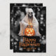 Feliz cartão de Dia das Bruxas com um fantasma assustador com um jack o’lantern. Personalize facilmente este cartão de Dia das Bruxas com seu nome e texto de família.