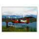 Um piloto de arbusto fica perto do seu flutuador de Havilland Canada DHC-2 Beaver na costa de um lago no extremo norte; montanhas e árvores estão à distância. Esta imagem foi derivada, em parte, de uma foto do Serviço de Pesca e Vida Selvagem dos EUA.