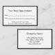 Este cartão de compromisso minimalista é duplo. Ambos os lados têm uma elegante borda negra. O lado um diz "Seu Próximo Compromisso" e tem linhas para a data e hora do compromisso. Na parte inferior, há texto de exibição que você pode editar para criar uma mensagem personalizada, se desejar. (Mostrado: Tenha gentilmente 24 horas de antecedência se não conseguir manter seu compromisso.) O lado dois tem texto a ser exibido para substituir pelo nome da empresa e seu endereço, número de telefone e site. Todo o texto pode ser editado ou excluído. O texto é preto.