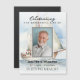 Este cartão de ímã de celebração de memorial fúnebre é composto por tipografia serifa e moderna em um veleiro aquarelado sobre um fundo oceânico com uma moldura branca e foto personalizada,