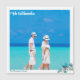 Um belo cartão magnético de Natal de praia, com uma foto familiar das suas férias na ilha, mantida na esquina por uma flor bonito de Hibiscus tropical, cor-de-rosa adorável, com folhas de palma verdes azuis.