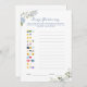 Respostas: 1. Doença da Manhã 2. Chá de fraldas 3. Gêmeos 4. Mãe-a-ser 5. Data de vencimento 6. Atos noturnos 7. Arma no forno 8. Epidural 9. A água dela quebrou 10. Menina ou Menino 11. Querida Lua 12. Cartão de chá de fraldas floral floral azul "Emoji Pictionary" para bebê, para download, com um design floral de cor aquosa impressionante, com azul e flores brancas, poeirentas e suaves, como a hydrangea. A letra manuscrita divertida adiciona um encantador toque de vintagem ao design e complementa perfeitamente os florais.