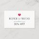 Encorajar os clientes a encaminhar os amigos com esses cartões de referência em preto e branco com um pop de cor-de-rosa fuchsia. Perfeito para salões, técnicos de unhas, maquiadores e boutiques, nosso design moderno e simples apresenta um coração cor-de-rosa quente com "consulte um amigo" e seu acordo de referência mostrado na frente (mostrado com "ambos receberão 20% de desconto"). Personalize o lado inverso com seus termos de referência, nome comercial, localização e informações de contato. Inclui espaço para os nomes do referenciador e do novo cliente.
