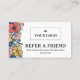 Cartão floral colorido com flores em coral, azul, amarelo e azul e o logotipo da sua empresa em um lado e um fundo cor-de-rosa claro coral no outro lado onde você pode escrever manualmente o nome do novo cliente e o nome do cliente de referência. Vibrante atraente para os olhos, consulte uma placa de amigo personalizada com seu logotipo, e impressa com muitas flores brancas desenhadas à mão e fontes encantadoras. Cartão de referência personalizado com logotipo e flores folclóricas em amarelo, coral e azul para seu salão, salão de beleza, pequena empresa. Pequenas empresas personalizadas referem-se a um cartão de amigo com um bonito design floral inspirado pelas cores folclinosas e das pradarias de verão.