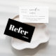 Este cartão de referência da empresa na moda "consulte um amigo" inclui tipografia em negrito e design branco mínimo.