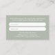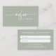 Estes cartões de referência modernos, verdes e brancos para pequenas empresas apresentam uma elegante tipografia de scripts manuscritos, para um olhar simples e minimalista que o seu cliente irá adorar. Essa design, ainda não declarada, funcionará para quase qualquer tipo de negócio, de um maquiador, de um cabeleireiro, de um maquiador, de um maquiador, ou até spa ou varejo. A parte de trás contém bastante espaço para você se personalizar totalmente com suas informações de loja ou de empresa.