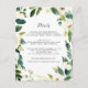 Projetado para coordenar com a nossa coleção de casamento Alabastro, este novo cartão verde de informação botânica e floral apresenta uma fronteira de verde, folhagem e flores brancas cercando seus principais detalhes de casamento, como acomodações de hotel, informações de recepção bem-vindas, site e muito mais. Adicione seu texto personalizado usando os campos fornecidos e use a função Personalizar para ajustar fontes, tamanhos e espaçamento.