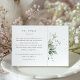 Forneça aos seus hóspedes todos os detalhes essenciais do seu dia especial com este cartão de informação de casamento elegantemente projetado. A carta apresenta uma ilustração de aquarela impressionante de verde com um talo boêmico, acentuado por speck ouros para um toque de luxo. Os tons de sábio, oliveira e eucalipto são complementados por estes destaques brilhantes, criando uma peça informativa e esteticamente agradável. O cartão é projetado para transmitir detalhes adicionais de casamento, como direções, especificações de cerimônia e preferências de presentes de uma forma tão adorável quanto o próprio evento.