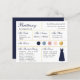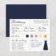 Um cartão de informações para madrinhas azul-marinho e dourado, incluindo informações sobre a data e local do casamento, as cores do casamento, os membros da comitiva, o vestido de madrinha e uma mensagem de convite para ser madrinha. O nome da madrinha e os títulos estão escritos em uma caligrafia elegante azul-marinho. No canto inferior direito, há um vestido azul-marinho. No centro, estão as cores do casamento em círculos. As cores, incluindo a cor do vestido de noiva, podem ser alteradas, com exceção do círculo dourado, que é de falso foil dourado. As cores padrão são azul-marinho, azul-pó, rosa-pó, rosa-bege e dourado.
