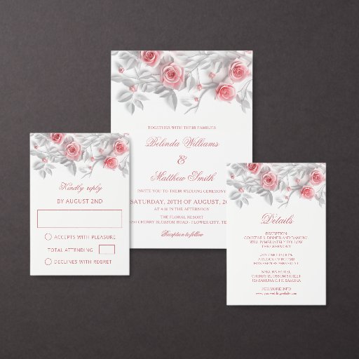 White pink gray 3D sculptured roses enclosure card. With a headline in an elegant classic script.