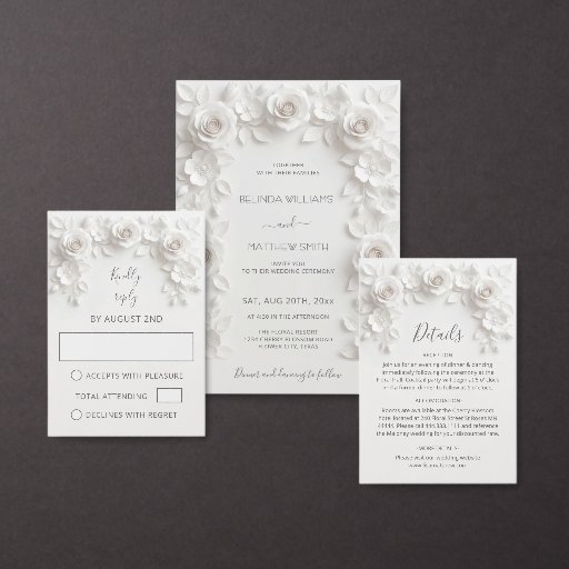 White 3D sculptured roses enclosure card. With a headline in an elegant handwritten script.