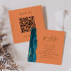 A borda esquerda deste elegante e moderno cartão de cerimônia de núpcias apresenta uma borda azul-lacrimejada com falsa brilho dourado. O título aparece em um script marrom de escrita manual, com texto personalizável abaixo em uma fonte em cores sobre um fundo laranja tangerino. Digite o código de URL do site de casamento para gerar um código QR para substituir a amostra no verso, enquadrado pelas palavras "digitalize-me para RSVP".