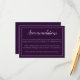 Informe aos seus hóspedes as informações sobre o alojamento do hotel com este adorável cartão de cerâmica roxo e prateado. Exibido em um fundo roxo, o cartão lê "Alojamentos" no topo com uma bela fonte prateada cursiva. Sua informação é apresentada em fonte prateada. Altere a cor, o tamanho e o tipo da fonte conforme desejar. Personalize o seu hoje! Design do Cartão de Enclosure de Casamento: WeddingsbyRhoadie