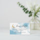 Bilhete de fralda do Dreamy boy, com chá de fraldas, com textura aquosa em azul no dorso, com lua reluzente dourada e estrelas. O cartão aos hóspedes que tragam um pacote de fraldas numa oportunidade de ganhar um prêmio.