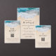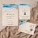 Summer wedding enclosure cards featuring blue ocean waves design. Add your wedding details in elegant modern typography on an illustrative beach scene.