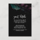 O cartão dos detalhes do convidado romântico de boho chic apresenta uma pena colorida e um fundo preto.