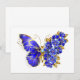 Borboleta de flores cinza, azul, safira, espumante com asa decorada com flores preciosos azuis com folhas de ouro sobre fundo branco.
