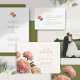 Chic com elegância moderna. Estes cartões de código de vestimenta de roupa branca apresentam um adorável buquê rosa-rosa-rosa-pincel, fontes contemporâneas em verde-azeitona e 4 cores complementares como inspiração de código de vestimenta.