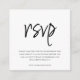 Procurando o cartão de RSVP perfeito para o seu casamento? Não procure mais! Nosso cartão de RSVP moderno e compacto personalizável apresenta uma tipografia elegante em preto que certamente impressionará seus convidados. Com um fundo branco limpo, você pode facilmente incluir seu próprio texto personalizado para torná-lo verdadeiramente único. No verso, crie um novo código QR que se vincula diretamente ao site do seu casamento para fácil acesso e conveniência. Vá para a opção "personalizar", adicione a URL do seu site de casamento na área fornecida e um código QR será gerado no design só para você. Encomende agora e deixe os RSVPs começarem a chegar!