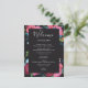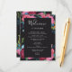 Itinerário do casamento Floral em preto com flores em rosa, azul e burgundy. Escreva seu itinerário de um lado, e uma nota de agradecimento do outro.
