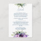 Cartão de inclusão de design floral roxo e verde com texto azul-marinho em um fundo branco crocante. Este cartão chique combina elegância atemporal com conveniência moderna, pois inclui um código QR discreto para fácil acesso a detalhes adicionais do casamento. O motivo floral vibrante adiciona um toque de sofisticação aos seus convites, tornando este cartão de inclusão a combinação perfeita de tradição e inovação para o seu dia especial.