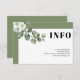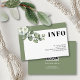 Quadro com eucalipto e flores brancas — cartão de detalhes do casamento. Este elegante design de casamento apresenta uma moldura branca e bordas verdes sábias. No canto superior esquerdo, há uma ramificação de eucalipto com flores brancas, enquanto a palavra 'INFO' está em tipografia ousada. A parte de trás é de cor verde-sábio com um código QR. Os convidados podem digitalizá-lo para ter mais informações.