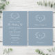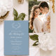 Cartões de cerimônias de casamento de monograma azul empoeirado. Design apresenta uma coroa de folhas desenhada à mão rodeando um monograma de casamento e um belo roteiro de caligrafia branca num fundo azul empoeirado.
