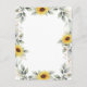 O design apresenta um verde aquoso, girassóis, elementos de ouro impressos e folhas botânicas láteas sobre uma moldura geométrica dourada impressa. A parte de trás apresenta um verde e uma coroa de girassol correspondentes.