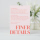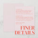 O cartão de design Belmont apresenta uma grande tipografia que diz "detalhes mais finos". Ao olhar para cima, os detalhes essenciais da celebração são apresentados graciosamente em uma fonte serifada clássica e pequena.
