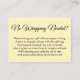 Se você estiver hospedando um chá de exibição sem presentes para uma noiva-a-ser, este simples e elegante cartão poderia ser a escolha para você. Usando uma fonte elegante, adicionei primeiro um cabeçalho que dizia "Sem Necessidade de Embrulhamento!" na frente, e "Presente com Amor, De:" para o lado da etiqueta de presente. Foi criado um campo de modelo para oferecer instruções para os convidados que não embrulhavam o seu presente; por favor, sintam-se livres para alterar a redação, se necessário. Todas as fontes e cores podem ser modificadas conforme você vê o ajustado.