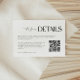Um cartão de detalhes de casamento preto e branco clássico e mínimo, projetado com letras de script e um código QR que seus convidados podem digitalizar para acessar seu site de casamento.