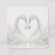 Cisnes adornam a frente e verso destes cartões de confirmação de presença de casamento oferecendo uma estética romântica. Com tons suaves de branco e cores prata escuro. Basta adicionar os detalhes do seu evento de casamento. Você também pode usar o código QR para sua confirmação de presença, site, lista de presentes de casamento e muito mais. Ótimo para ocasiões especiais. Use o modelo para criar seu próprio cartão de confirmação de presença de casamento com código QR de cisne romântico.