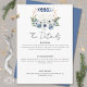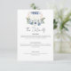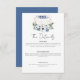 Este convite de casamento Boho apresenta fases da lua crescente e cheia em aquarela com flores brancas e azuis,