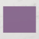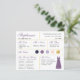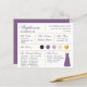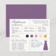 Um cartão de informações de madrinha para um casamento roxo e dourado, incluindo informações sobre a data e local do casamento, as cores do casamento, o grupo da noiva, o vestido de madrinha e uma mensagem de proposta de madrinha. O nome da madrinha e os títulos são escritos em uma caligrafia elegante roxa empoeirada. No canto inferior direito, há um vestido roxo empoeirado. No centro, estão as cores do casamento em círculos. As cores, incluindo a cor do vestido de noiva, podem ser alteradas, com exceção do círculo dourado, que é de falso foil dourado. As cores padrão são azul-marinho, roxo empoeirado, lavanda (roxo claro), rosa bege e dourado. A parte de trás é roxa empoeirada, como a cor do vestido de madrinha.
