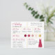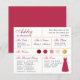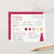 Um cartão de informações de madrinha com dourado e várias tonalidades de vermelho e rosa, desde borgonha e um vermelho/magenta moderno até rosa poeirento e blush, incluindo informações sobre a data e local do casamento, as cores do casamento, o grupo da noiva, o vestido de madrinha e uma mensagem de convite para ser madrinha. O nome da madrinha e os títulos estão escritos em uma fonte elegante. No canto inferior direito, há um vestido vermelho magenta. No centro, estão as cores do casamento em círculos. As cores, incluindo a cor do vestido de noiva, podem ser alteradas, com exceção do círculo dourado, que é de falso ouro laminado.