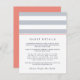 Projetado para coordenar com as nossas coleções de convites para casamento da Metro Stripe e cinzas, este cartão simples e chic apresenta uma inscrição azul à meia-noite com cinzas pálidas largas e listras brancas e uma banda fina e contrastante de coral de verão vibrante. Substitua o texto da amostra pelos detalhes chave da sua celebração do casamento. Cartões à volta de coral sólido. Que informações incluir em um convite de casamento? Considere detalhes como acomodações de hotel, códigos de grupo, transporte, informações de recepção de boas-vindas e sua URL do site de casamento.
